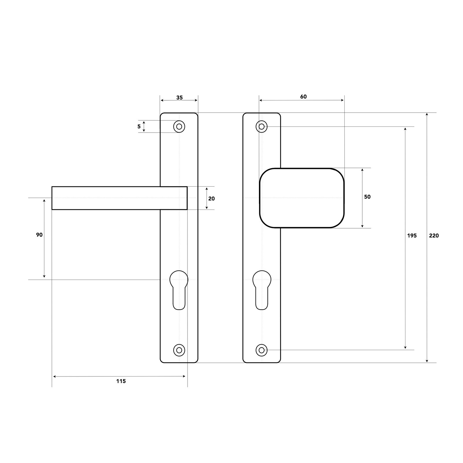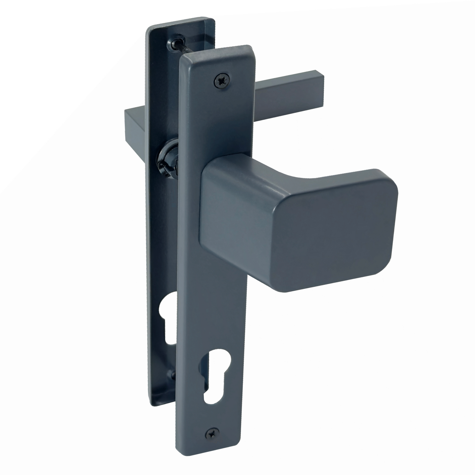 Klamko - pochwyt z szyldem w kolorze antracytowym o rozstawie funkcyjnym 90 mm.