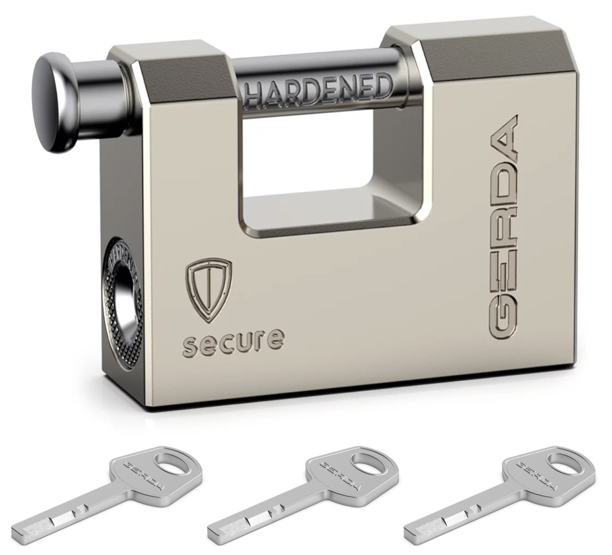 - Kłódka trzpieniowa Gerda Secure z niklowanym korpusem i hartowanym trzpieniem. Odporna na korozję, z blokadą klucza przy otwarciu. Długość 70 mm, 3 klucze w zestawie. Certyfikat Instytutu Mechaniki Precyzyjnej.