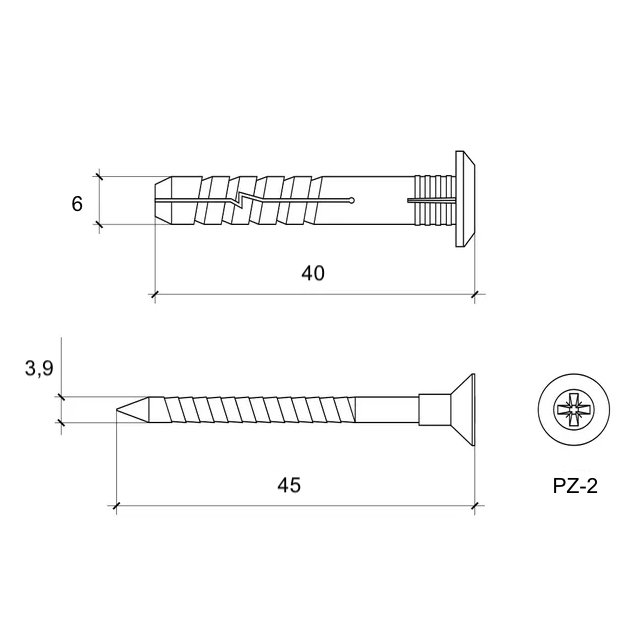 Kołki posiadają korpus o wymiarach 6 × 40 mm oraz wkręt 3,9 × 45 mm, co zapewnia optymalne parametry montażowe i szerokie zastosowanie w pracach budowlanych, wykończeniowych i instalacyjnych.