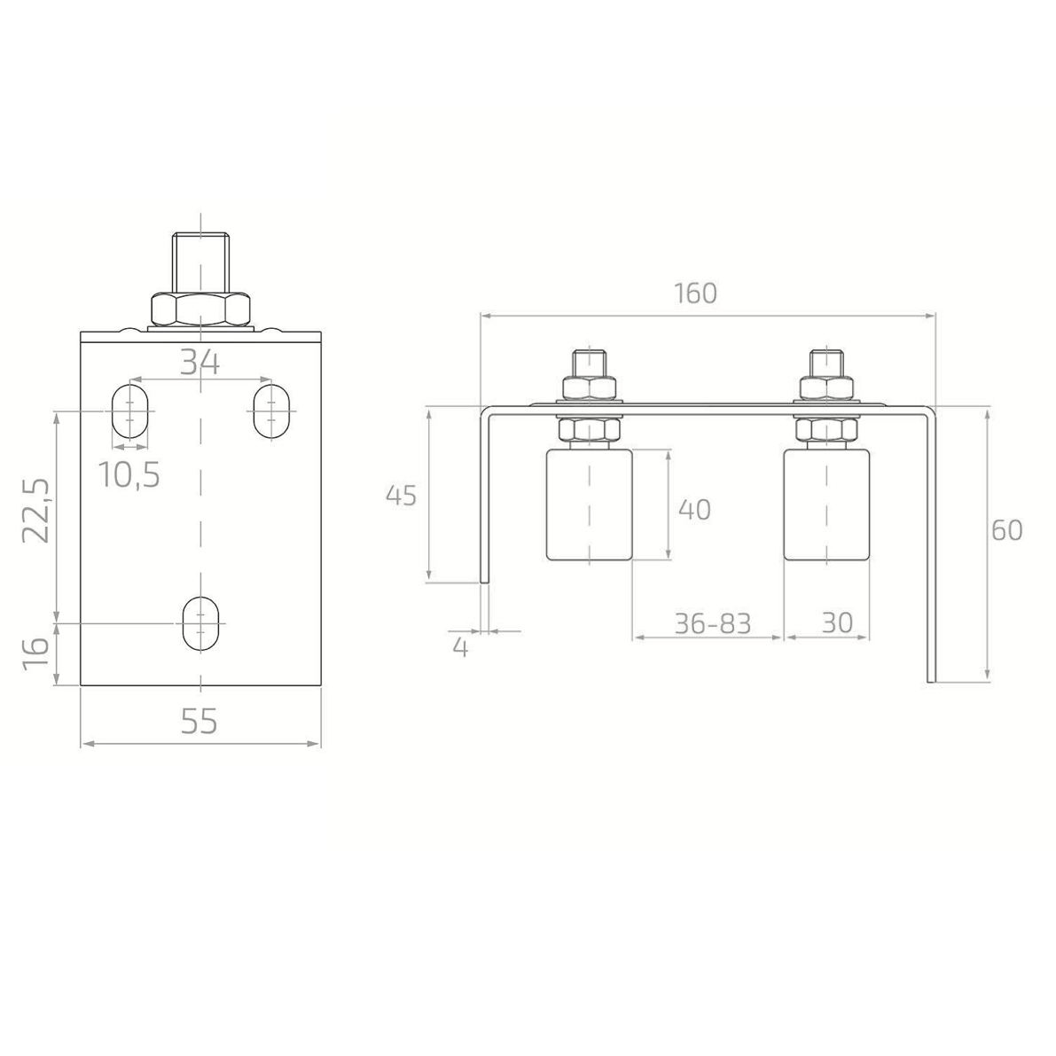 Prowadzenie górne do utrzymania bramy przesuwnej w pionie podczas otwierania oraz zamykania. Prowadzenie jest przeznaczone do bramy wykończonej w górnej części profilem zamkniętym o prostym kształcie bez wystających, ozdobnych elementów. Produkt jest przeznaczony do przykręcenia do muru lub słupka.