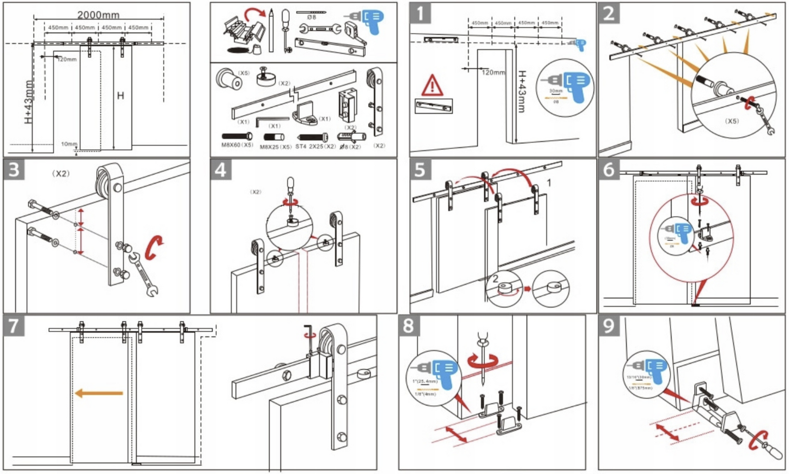 System BARN DOOR został zaprojektowany tak, aby jego montaż był szybki, intuicyjny i możliwy do wykonania samodzielnie. Dołączona instrukcja prowadzi krok po kroku przez cały proces instalacji, dzięki czemu w krótkim czasie możesz cieszyć się funkcjonalnym i stylowym systemem drzwi przesuwnych.