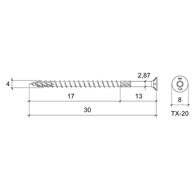 - Wkręty ciesielskie Wkręt‑Met® 4×30 mm z łbem stożkowym Torx. Idealne do konstrukcji drewnianych, z powłoką woskową, podwójnym gwintem i frezem ułatwiającym montaż. Mocne, szybkie wkręcanie bez nawiercania. Opakowanie 500 szt.