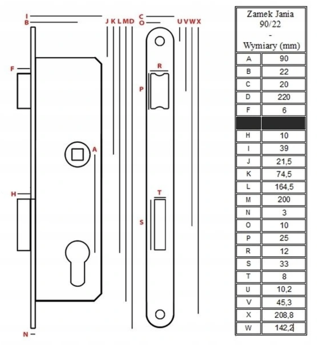Zamek rolkowo - zasuwkowy wąski firmy Jania o wymiarach funkcyjnych 90/22 na wkładkę do drzwi zarówno prawych jak i lewych.
