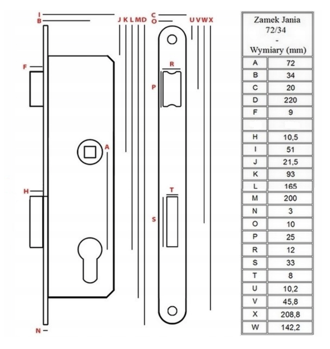 Zamek zapadkowo - zasuwkowy firmy Jania o wymiarach funkcyjnych 72/34 na wkładkę do drzwi prawych.