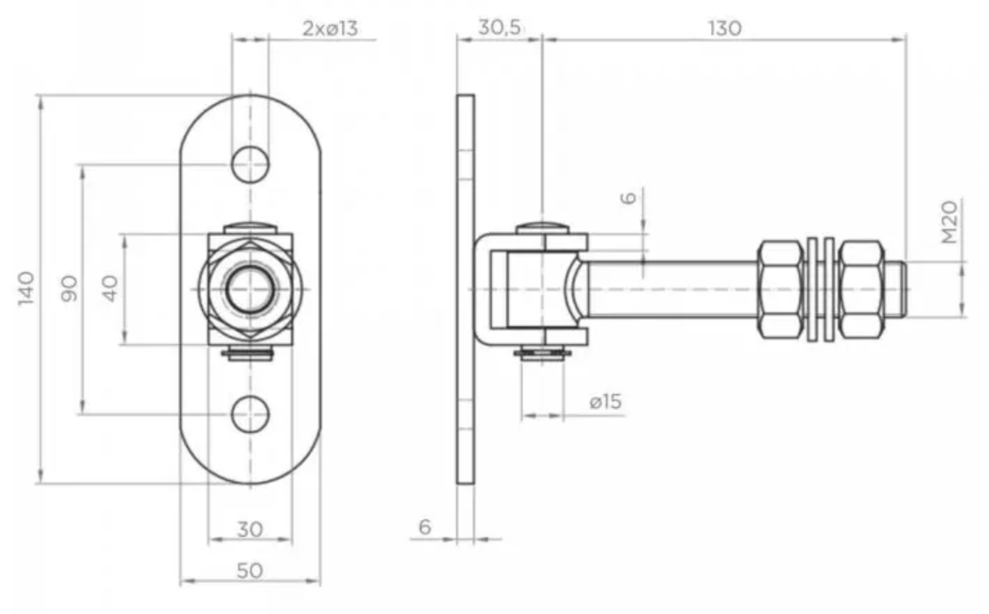 Zawias regulowany do przykręcenia M18 L-130 z szyldem 140x50x6 mm