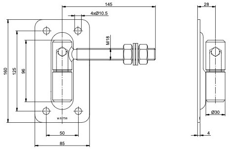 Zawias regulowany toczony Fi30 z kulką M18 z szyldem 160x65x4 mm