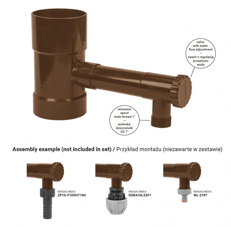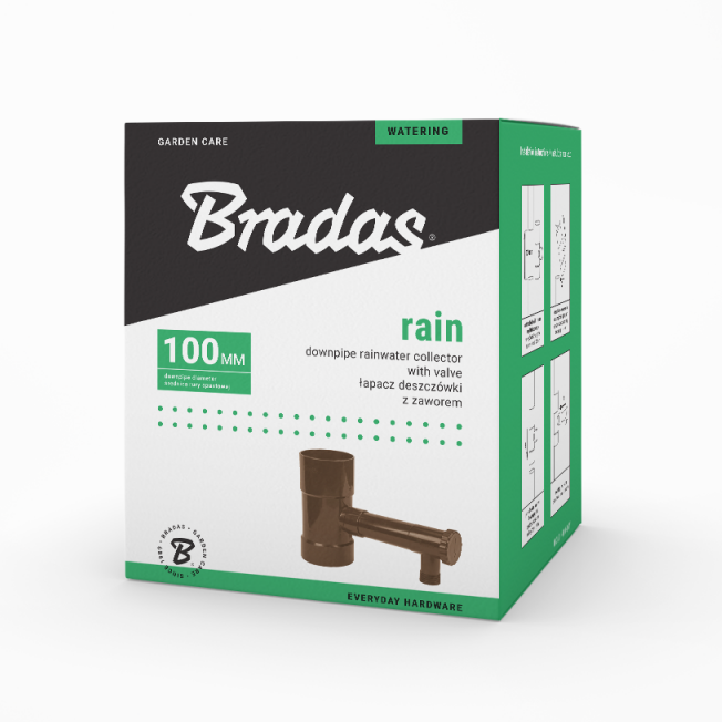 • Zbieracz wody deszczowej Bradas® 100 mm to trwały i uniwersalny łapacz deszczówki z zaworem regulacji przepływu. Odporny na UV, pasuje do rynien PCV i metalowych, zapewnia wysoką wydajność i szybki, intuicyjny montaż. Kolor brązowy.