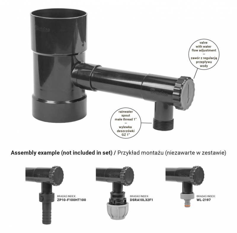 • Zbieracz wody deszczowej Bradas® 100 mm to trwały i uniwersalny łapacz deszczówki z zaworem regulacji przepływu. Odporny na UV, pasuje do rynien PCV i metalowych, zapewnia wysoką wydajność i szybki, intuicyjny montaż. Kolor antracyt grafit.