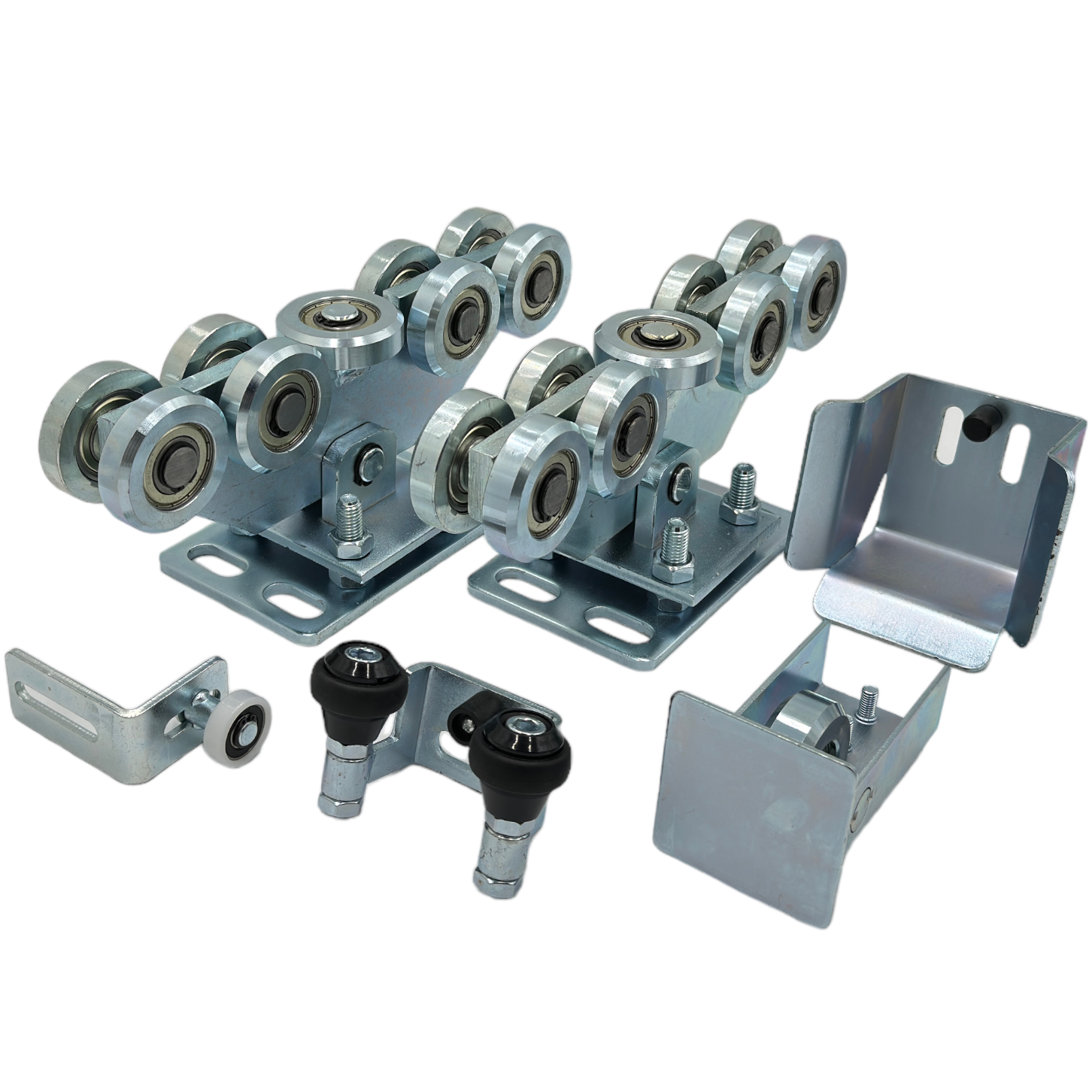 Kompleksowy zestaw wózków bramowych 9-rolkowych wraz z niezbędnymi akcesoriami.